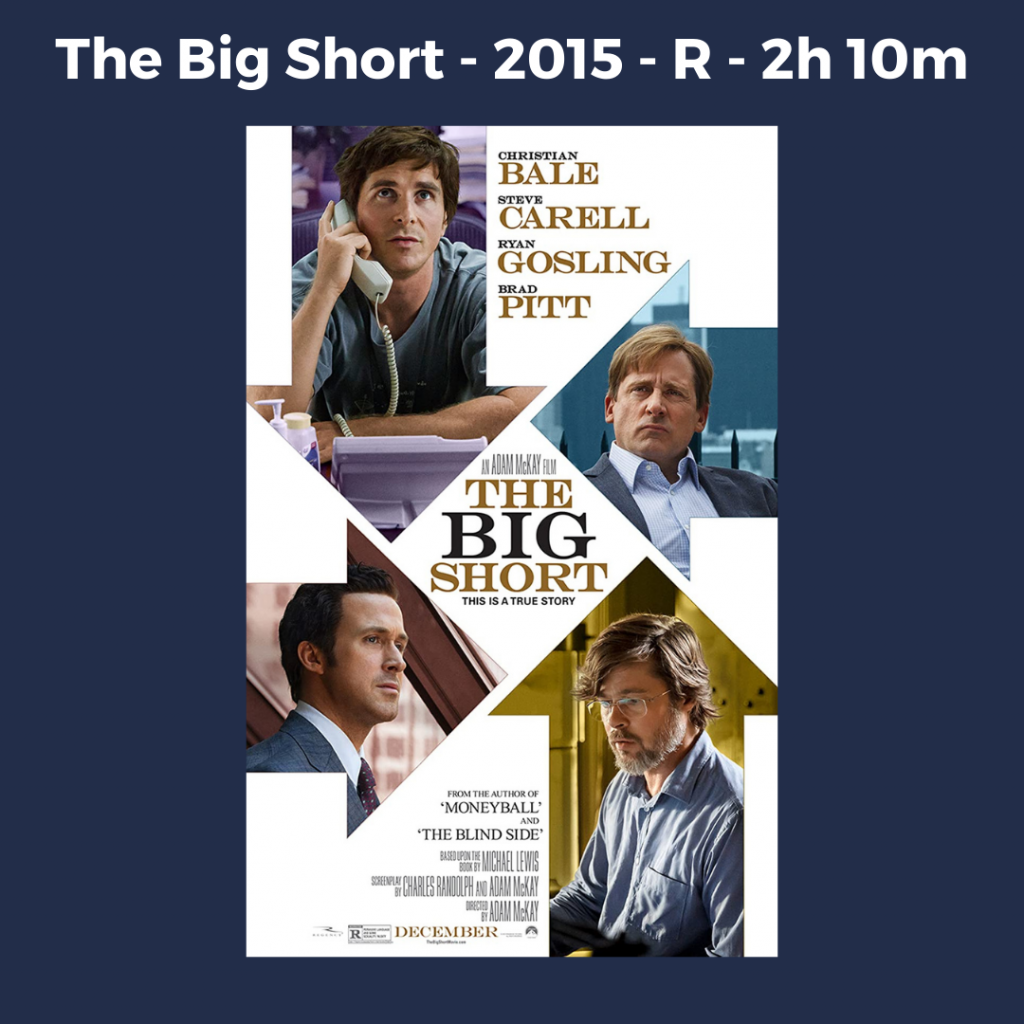 Summary: Based on the book by Michael Lewis, The Big Short is a drama based on some of the earliest people to notice that the subprime mortgage market was in danger of defaulting. It then goes on to show how popular sentiment thought that these traders were crazy for thinking that the housing market was going to fail on a national scale. The movie does an excellent job educating the audience on what happened during the housing crisis through storytelling and humor. The movie has a star-studded cast with cameos from numerous well-known celebrities. This is a must-watch if you want to know more about the mortgage crisis, and how some of Wall Street was able to make money on the fall of the national housing market.