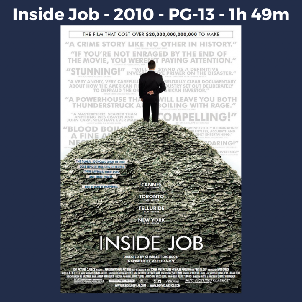 Summary: Narrated by Matt Damon, Inside Job is a documentary that provides insights and detail into the great recession that cost the world over $20 trillion dollars. This documentary has interviews with key financial collaborators who were involved in the creation of this recession. See how the great recession not only affected the United States but the world.