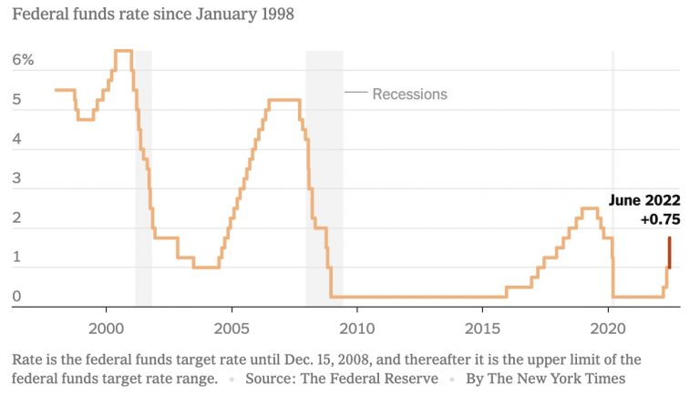While many factors go into why interest rates rise or fall. The primary reason for the increase in interest rates is to combat rising inflation. Have you noticed that the price of literally everything is going up? From basic needs like gas, food, and clothing to wants like vacations and concert tickets. We are coming out of a period of historically low-interest rates. Lowering interest rates during economic turmoil like recessions or a global pandemic is one of the ways the federal reserve tries to help the economy by making access to debt financing more affordable and accessible to businesses and consumers. See the chart below from the New York Times that shows the federal funds rate dating back to 1998.
